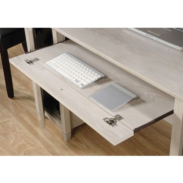 The small drawer below the desk pulls out to reveal a keyboard. This drawer is on metal runners with safety stops to ensure it doesn’t fall out of place. As seen in the second picture, this keyboard easily slides out when in use and can be hidden away again after.