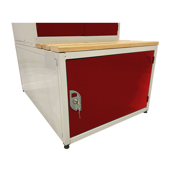 - Storage and Seats - Add seating and additional storage to the base of each locker. Choose from Oak slats of MFC top seats, suitable for up to 3 lockers at a time (up to 1800mm wide). All units are 450mm high. With the addition of these storage units, each locker's height would total 2250mm.